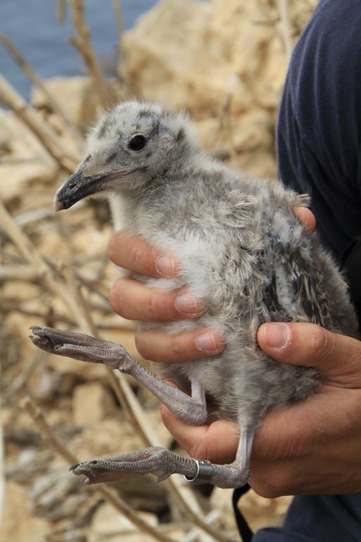 As previously mentioned whilst on Filfla we searched for any Yellow-legged Gulls’ chicks. At the time of this visit, most of the Yellow-legged Gulls had already fledged. However, due to multiple reasons some gulls may lose their eggs earlier in the season and lay a second clutch in order to try again (in contrast to the Storm-petrel and Scopoli’s Shearwater which only lay one egg per season!). By doing this it can mean that chicks are often at various sizes and on each trip not all individuals can be rung. On this trip 5 youngsters were ringed.